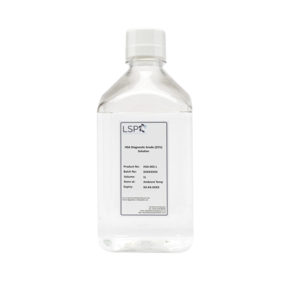 This diagnostic-grade product is an aqueous solution containing 20% human albumin (w/v). It is prepared by cold-alcohol fractionation from pooled human plasma obtained from venous blood. The USP Pharmacopeia requires that all fractionators add sodium caprylate and sodium tryptophanate as a preservative. All human plasma Is collected from stringently screened donors at FDA-licensed collection