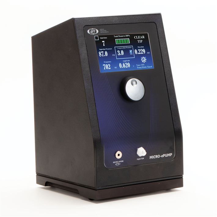 WPI’s MICRO-ePORE™ Pinpoint Cell Penetrator technology is embedded inside the MICRO-ePUMP. When the researcher enables the MICRO-ePORE™, it delivers a highly localized voltage signal to a targeted injection site to facilitate penetration with minimal trauma. The researcher determines the amplitude and frequency of the signal that best suits the application. The signal originates in the control box, and it is transmitted through the electrode interface cable to the microelectrode holder. A silver wire is used to transmit the signal into the electrically conductive substance being injected. A reference electrode is used to place the media at 0.0 V potential with reference to the generated voltage.