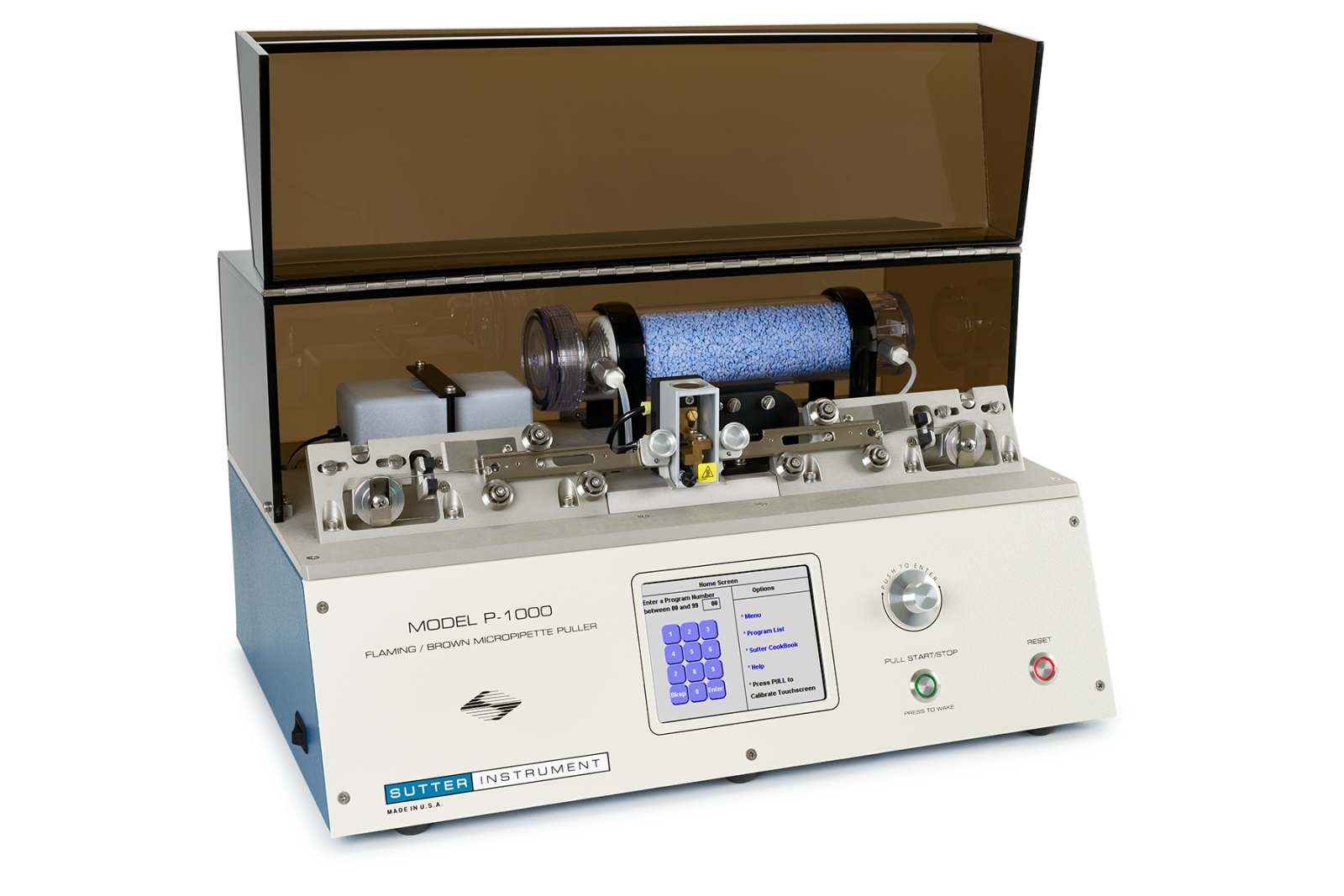 P-1000 je vytahovač mikropipet Flaming/Brown nové generace od Sutter Instrument, vybavený barevným dotykovým displejem, vestavěným Pipette Cookbook s více než 100 předprogramovanými programy, předehřevem čelistí ThermoLock™, režimem Safe Heat Mode a komplexní diagnostikou. Táhne veškeré druhy skla kromě křemene; průměry hrotů 0,06–3 µm.